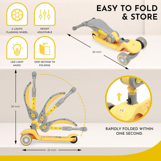 3-Wheel Folding Kick Scooter with Adjustable Height, Non-Slip Deck & Flashing Wheels – for Kids 2–12 Years (Yellow & Grey)
